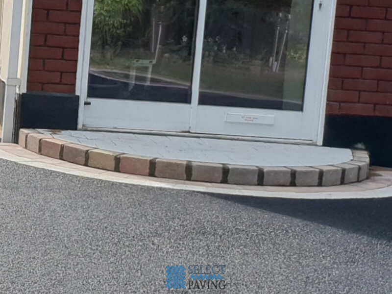 Replaced the old driveway, new foundation laid on the driveway. Added a new paved border around the driveway using two different colours of Corrib paving and built a circular step using square kerb sets at the front door.